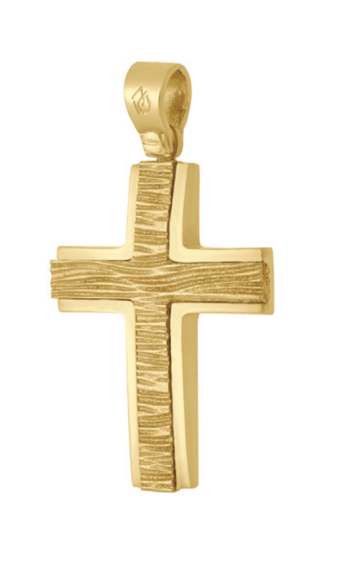 Σταυρός χρυσός 14 καρατίων με λουστρέ φινίρισμα στις άκρες και  κέντρο με σαγρέ ανάγλυφη επιφάνεια